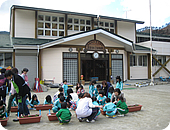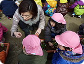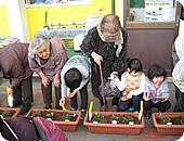 当日、30名の園児たちに仮設住宅のお年寄り15人ほどが加わり、仲良く植替えをしました。先生も慣れたもので、「おじいちゃん、おばあちゃんは腰が痛くてしゃがめないから、シャベルで掘るのは子どもたちがやってね」と、さりげなく役割分担を指示。手際良く植替えが終わると、お年寄りたちは「じゃあ、またね」と、手を振りながら隣の住宅に帰って行きました。
