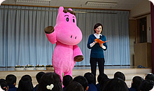 まずはフジテレビ・武田祐子アナウンサーによる春を題材にしたおはなしの朗読、そして地元では有名人(?)の岩手めんこいテレビのキャラクター「ミット君」と一緒に「ちびまる子ちゃん」の「ピーヒャラダンス」で体を温め、いよいよ園庭での植替えです。ディノス・セシールが地元に栽培を委託した春の花「ビオラ」の苗約100株が用意され、園児たちがシャベルでプランターに植え替えて完成。園児からスタッフ一人ひとりに、手作りのしおりがお礼にプレゼントされるサプライズもあり、感激の余り泣きそうになりました。