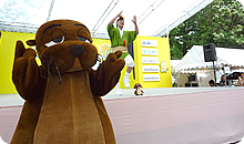 高知さんさんテレビの「さんのすけ」 土曜日の昼に開催されたスペシャルステージに参加したのはフジテレビから谷岡慎一アナウンサー、高知さんさんテレビの野村舞アナウンサーと高知さんさんテレビのキャラクター「さんのすけ」。スペシャルゲストとして「どっこくん体操」を考案してくれたアトランタ五輪体操日本代表の田中光さんも登場。