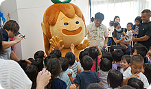 午後におじゃました「ひらまつ保育園」では、およそ60人の子どもたちが待っていました。午前と同じように紙芝居とダンスをみんなで楽しみました。こちらでは特に「ゆーたん」が大人気。ダンスの途中も終わった後も身動きができないぐらい、子どもたちに囲まれていました。