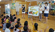 野菜探しクイズでは、さすが南国沖縄の子。紙芝居で「ニガウリ」を探す時に、金城アナウンサーが「ニガウリは、ゴーヤともいうんだよ~」とヒントを出した瞬間、ほとんどすべての子どもたちが割れんばかりの声で「はーい!」と手を高くあげ、前へ駆け寄りました。選ばれて前に出てきてくれた子どもはもちろん正確にニガウリを探し当てました。