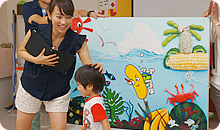 午前中に訪れた「なないろ保育園新都心」では、およそ80人の子どもたちが元気よく私たちを出迎えてくれました。大きな紙芝居が始まると、目をキラキラさせて食い入るようにみては元気よく反応。
