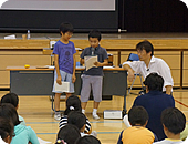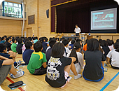 アナウンサーの仕事に関するクイズもしました。普段、見ているだけでは気づかない、テレビの裏側に関するクイズです。ニュースの時に使っている小さな道具やスタジオの中を、普段とは反対方向から写真に撮り、スクリーンで見せながらテレビのいろいろな仕組みを二択問題にして、考えてもらいました。広い体育館の真ん中に線を引き、選んだ答えによって場所を移動してもらうことにしたので、それぞれあっちへいったりこっちへいったり…。楽しく学んでもらえたと思います。