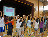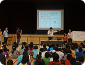 今回は体育館での親子体験授業でした。子どもたちが約130人、保護者の方も70人ほど。先生も合わせると200人を超える大授業でした。お昼を食べた後の2時間。最後まで集中して楽しんでもらえるように、内容を整理して臨みました。