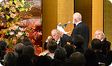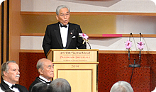 謝辞を述べるアソル・フガード氏 式典では、功績をたたえる顕彰メダルが常陸宮殿下からそれぞれの受賞者に授与。