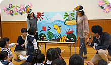 元気いっぱい授業が始まると、子どもたちも元気いっぱい、前のめりで紙芝居を聞き入っていました。「○○知っている?」と聞くと、教室のあちらこちらに高知弁で「知っちゅうー!(=知っている)」という声がなんとも可愛い。