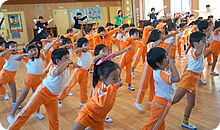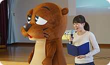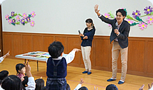 紙芝居の後は、高知さんさんテレビの「さんのすけ」も加わり、みんなで「どっこくん体操」、「ピーヒャラダンス」を一緒にノリノリで踊りました。大村アナウンサーが「めざましテレビ」を担当していることから、試しに子どもたちと「めざましじゃんけん」をしてみたらこれも大盛り上がりでした。