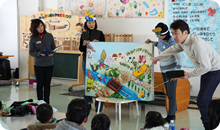 握手をしたり、抱っこをしたりした後、食育出前授業「どっこくん」の紙芝居を楽しんでもらいました。