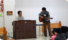 2009年に初めてお邪魔した時にも、楽しいギターを聴かせてくれた、滝川出身ミュージシャンの「こうたろう」さんです。久しぶりにお話ができてとてもうれしかったのですが、お昼ご飯の後、こうたろうさんのギターと私のキーボードで即席ライブをすることが決まりました!