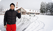 まず訪れたのは「湯口大谷幼稚園」です。普段は子どもたちが遊びまわる広い校庭も一面の銀世界です。