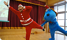 子どもたちと一緒に歌う「あわてんぼうのサンタクロース」、そして、「ピーヒャラダンス」、講堂中に元気があふれ出します。