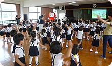 消化の仕組み~「どっこくんの紙芝居」で頭を使った後は、アナウンサーから発声指導、お馴染みのどっこくん体操。さらに、ちびまる子ちゃんの「ピーヒャラダンス」で体を思い切り動かしてもらいました。