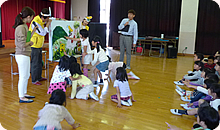 保護者の皆様の目に少々緊張しつつも、当初の意気込みを思い出し、自分の中でテンションをさらに上げて「どっこくん」の紙芝居に臨みます。すると、先ほどまで静かすぎるほどだった子どもたちが、一生懸命に大声で季節の食べものの名前を叫び始めるではないですか!