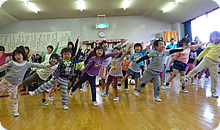 私も子どもたちと「発声練習」したり、「どっこくん体操」をするうち、だんだん体がほぐれてきて、終盤の「ピーヒャラダンス」では、大汗に・・・