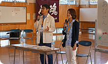 岸野文絵アナウンサーと塩原恒夫アナウンサー 今回は、小高商業高校の3年生の皆さんとプレゼンテーションの授業でした。