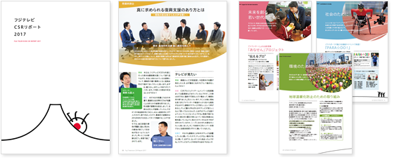本報告書はフジテレビが2016年4月から2017年3月までに行ったCSR活動をまとめたものです。この1年間、フジテレビが実施したCSR活動を「未来を創る若い世代のために」「社会のために」「環境のために」「災害復興支援」の主に4つのカテゴリーに分けて記載しています。2016年度は特に熊本地震の復興支援活動に重点を置き、熊本・嘉島町の町民課長を招いての座談会「真に求められる復興支援のあり方とは」や「熊本地震復興支援活動まとめ」ページを設けました。