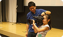 まずは、「テレビカメラマンのお仕事」について、“本物”の現役カメラマンが映像を見せながら説明。そのあとは「ビデオエンジニア」の仕事(=画面の色調整や画像の切り替え)を、大きなスクリーンを使って実演も交えながら披露しました。