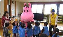 ミット君と米澤かおりアナ 今回は花巻市の花巻幼稚園と南城保育園の子どもたちに会ってきました。