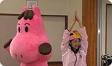 ミット君とタッチ! その後一緒に踊った「どっこくん体操」、「ピーヒャラダンス」は子どもたちのみならず、父母の皆さん、幼稚園の先生まで会場にいる皆さんが一緒に踊ってくださり、熱気に包まれました!