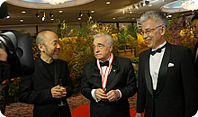 | 俳優の塚本晋也さん(左)、 マーティン・スコセッシさん(演劇・映像部門受賞)、 イッセー尾形さん(右) |
