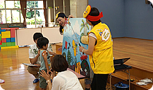 沖縄テレビのキャラクター「ゆーたん」紙芝居が終わり、沖縄テレビのキャラクター「ゆーたん」が登場すると大きな歓声が上がり、写真撮影でも大人気!