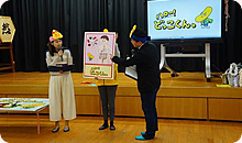 紙芝居では、野菜の名前を言いたくて、たくさんの子どもたちが前に出てきて大賑わい、熊本では「にがごり」という「にがうり」もしっかりわかってくれ、おおきな声で「そこ、そこ」と元気いっぱいに指を指します。