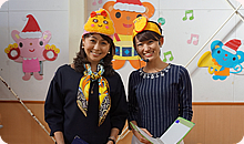 山中章子アナ(左)と岡田愛マリーアナ(右)翌朝、岡山放送(OHK)の岡田愛マリーアナウンサーと一緒に、岡山市内にあるちとせ保育園へ。