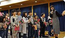 まずはフジテレビ久代萌美アナウンサーとともにミニアナウンス講座を行い、子どもたちと一緒に早口言葉などに挑戦しました。