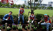 前日の雨が上がり、朝から強い日差しが照りつける中、 まちづくり協議会に所属する企業・団体から100人以上が大集合! フジテレビからも9人が参加し、花の苗を植えました。