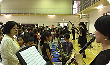 物語が終わると、新美アナと一緒に大きな声で発声練習。そして、最後は「アンサンブル・ミクスト」の演奏に合わせて、全校生で「ビリーブ」を熱唱、体育館に元気いっぱいの歌声が響き渡りました。