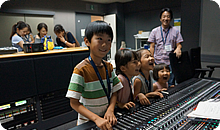 スタジオサブはいつもと違って子どもたちの興奮した笑い声で賑わっていました。普段担当者以外にはなかなか触らせないボタン一つ一つが押されると、いろいろな音や映像が出てきて、どよめきが。いつも真剣な表情の技術スタッフたちの顔にも笑顔が溢れていました。