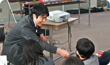 「声」を出すことの大切さを知ってもらいます。アナウンサーが実際に使っている練習内容が載っている『あなせん』テキストを渡すと、みなさん興味津々。自発的に読み出してくれて、早口言葉に挑戦していました。「できた!」といって嬉しそうにしている子や、「難しいけどもう一回!」と何度もトライしている子など、自然に声を出す楽しさを感じてくれていました。