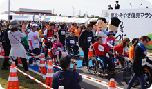 10月13日 心地よい日差しの中、この日は車いすジョギングと親子ペアマラソンが行われました。自分のペースで走る車いすランナー、手をつなぎ笑顔で走る親子などみんなでイベントを楽しんでいました。サザエさん一家はゴールでメダルを授与してランナーたちと触れ合いました。