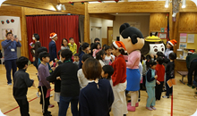 むかわ町はシシャモ、メロンや、むかわ竜が有名な町です。11日はむかわ地区のひかりこども園とむかわ放課後こどもセンター、12日は穂別地区のさくらこども園と穂別放課後こどもセンターに、戸部洋子アナウンサーとUHB北海道文化放送の川上椋輔アナウンサーが進行し、サザエさんとUHBのキャラクター「みちゅバチ」が登場すると子どもたちも先生方も大盛り上がりでした。