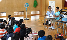 暑い日でしたが、窓を開け放ち、風がとおる体育館に集まった横浜市立東希望が丘小学校4年生の子どもたち(3クラス)は、とても健康的で、元気でした。大きな声で発声練習、そして早口言葉、ニュース原稿読み、どれも思い切り、楽しく体験してくれました。私が子どものころと比べて、みんなとても上手。いろいろなメディアに触れたり、人前で発表する機会がとても多いのではないかと思いました。