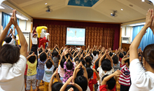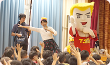 そして最後は、テレビ新広島のキャラクター「ヒロシマイケル」も合流して、子どもたちと楽しく「良いうんち」を作るための体操、「どっこくん体操」にみんなで挑戦!楽しいリズムと簡単な振り付けで、園児たちのボルテージは最高潮に!!