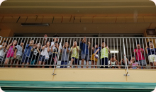 お別れの時間。「どこからか声がするなあ」と外を見ると、2階の廊下から車に乗り込む私たちにみんながお見送り!