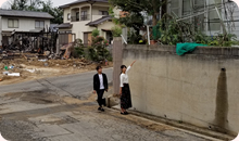 続いて向かったのは、山肌がはっきりと見えるほど大きな土砂崩れが起きた熊野町。足に力が入るような勾配の坂道。新しく建った家の壁すらも持っていくほどの土砂崩れは、その流れとは反対向きの車庫にも土砂が流れ込んでいて、その勢いのすさまじさを感じました。自分の身長よりもさらに高いところまで茶色に変色した壁は当時の様子を物語っています。