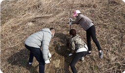 国道6号線の土手に、40本あまりの苗木を手分けして植えていきますが、苗木といっても2メートル近くあり、かなりの重さです。しかも斜度45度くらいの斜面にまっすぐ植えるのはなかなか骨が折れます。2月とは思えない陽気の中、汗ばむほどでした。