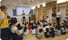 自己紹介やフリートーク、めざましジャンケンなどで盛り上がった後、『ハロー!どっこくん。』の紙芝居を行いました。子どもたちみんながとても楽しそうに紙芝居を聞いてくれ、クイズにも積極的に参加してくれて、授業をしている私も楽しむことができました。