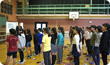 まずは肩に力を入れないでリラックスして声を出す練習。姿勢を正して…飛び跳ねて…肩を揺らして…あぁあぁあぁあぁあぁぁぁぁ~と発声。肩を上下させるのが面白いのか、みんなゲラゲラ笑いながらやってくれました。