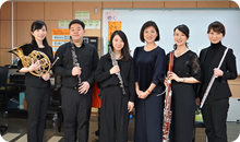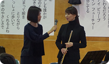 「アンサンブル・ミクスト」の皆さんは、美しく優秀なプロの演奏家集団。でも普段は、とっても気さくで、始まる前から久しぶりにお会いしたメンバーとは近況の話に花が咲きました。そんな温かな雰囲気の中、演奏が行われたのは・・・少々冷えた体育館。(この時期の小学校の体育館ですから、当然です。)