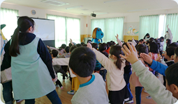100人近い子どもたちが集まり、授業がスタート!「かっこいいうんちとお友達になろう!」というのがこの授業の大きなテーマ。「毎朝ちゃんとうんちしてる人―??」という質問に元気な返事が返ってきます。