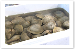 さぁ、漁を始めて10分が経過し、カゴを上げてみると…なんと20個以上ものホンビノスガイが入っているではありませんか。しかもその一つ一つがとても大きく、立派で重量感があり、これでもか!というほどたっぷりとしています。結局この日は30分の漁で50個ものホンビノスガイが獲れ、大漁過ぎて魚篭(びく)が持ち上がらない程の釣果でした。
