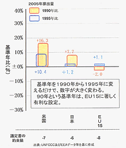 こうして-6%という不公平とも思える削減義務を負ってしまった日本ですが、重要なのは「基準年」の設定。1990年比でどれだけ削減するかというこの目標設定は、はなから加盟国の拡大により、あまりにEUに有利だということがわかっていました。