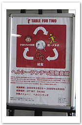 食堂入り口でお出迎え。1食20円の寄付で国際貢献を!と呼びかけ、今年2月から3ヶ月間、テレビ局としては初めてTABLE FOR TWO(以下、TFT)に参加したフジテレビ。