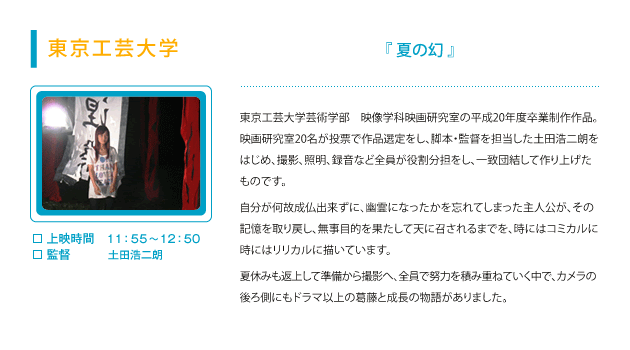 多摩美術大学/東京工芸大学/日本大学/武蔵野美術大学/早稲田大学/日本映画学校(在京6校) |