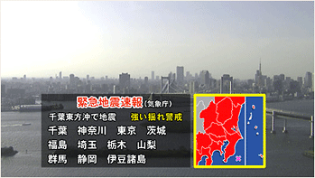 フジテレビは、気象庁が緊急地震速報(推定震度5弱以上)を発表し「強い揺れ(震度4以上)」が放送エリア内(関東各地、山梨、伊豆諸島など)に予想された場合、CM中も含めて速報スーパーでお伝えします。