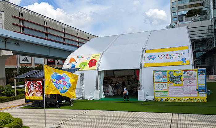 社屋前に「楽しくアクション!SDGsパーク」 新型コロナウイルスの影響で2年間開催できなかったリアルでの夏イベントが、3年ぶりに開催されました。フジテレビの1階広場に巨大テントが出現!