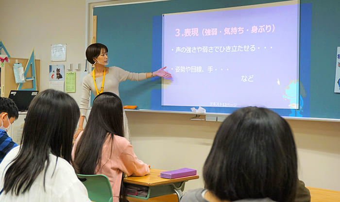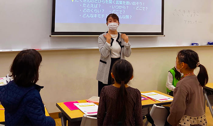 この日は雨模様で、少し肌寒い1日に。ですが、最初の挨拶から明るい声が響き、温かい素晴らしい雰囲気の中での授業となりました。普段、スピーチがなかなかうまくできないという子どもたちの苦手意識を少しでも克服できるように、授業スタート!